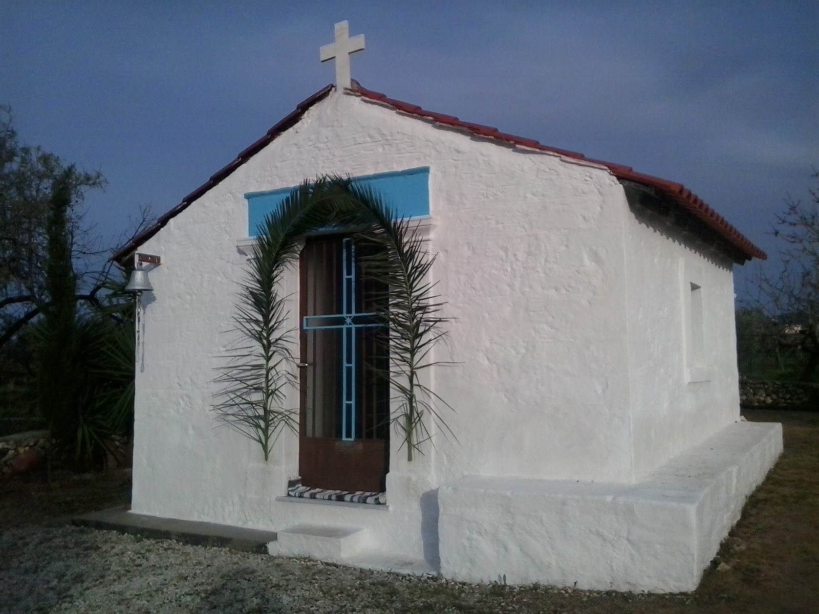 Μέσα στα χωράφια ξεχωρίζει ο λευκός όγκος του, με την κεραμοσκεπή του, το μικρό καμπανάκι και το λευκό σταυρό του στην πρόσοψη.