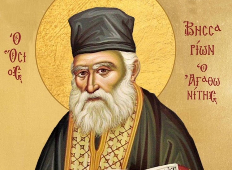 «Τού χορού τών πατέρων Μονής Αγάθωνος, θεοφιλέστατον θύτην καί Φθίας άνδρα λαμπρόν, τών πενήτων τήν χαράν, καί ακριβέστατον, αμαρτανόντων ποδηγόν, πρεσβυτέρων τού Χριστού, τόν τύπον τής ευσεβείας, τόν Βησσαρίωνα πάντες από καρδίας τιμήσωμεν», ψάλλουμε στο απολυτίκιο του Αγίου Βησσαρίωνα του Αγαθωνίτη.