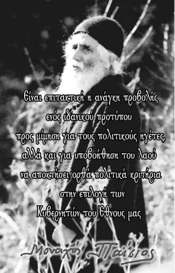 Άγιος Παΐσιος: “Είναι επιτακτική ανάγκη προβολής ενός ιδανικού προτύπου προς μίμηση για τους πολιτικούς ηγέτες, αλλά και για υποβοήθηση του λαού να αποκτήση ορθά πολιτικά κριτήρια στην επιλογή των κυβερνητών του Έθνους μας”.