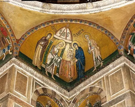 Έπειτα από σαράντα ηµέρες, όταν έφτασε ο καιρός του καθαρισµού της µητέρας, έπρεπε σύµφωνα µε το Μωσαϊκό νόµο, να πάνε το παιδί στα Ιεροσόλυµα, στο ναό τουΣολοµώντα για να αφιερωθεί στο Θεό, µια που ήτανε τοπρώτο παιδί της Μαριάµ και µάλιστα αγόρι. Θα πρόσφεραν µάλιστα και θυσία στο Θεό ένα ζευγάρι τρυγόνια ή δύο µικρά περιστέρια. Έτσι ο Ιωσήφ παρέλαβε το παιδί και τη µητέρα Τουκαι ξεκίνησαν για την αγία πόλη.