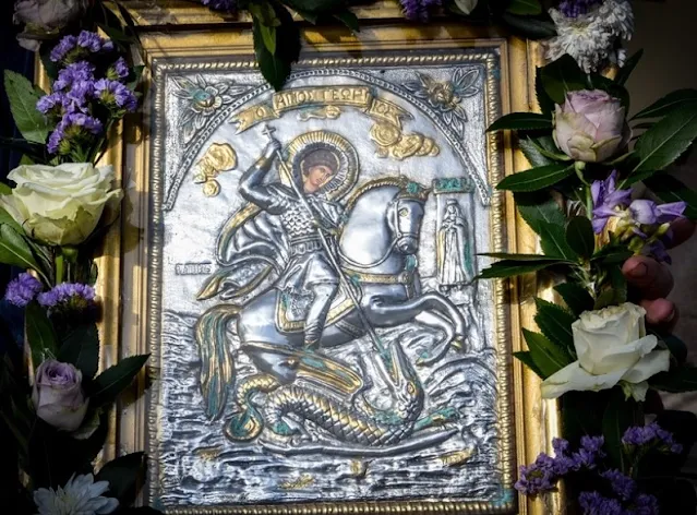 “Ἀξίως τοῦ ὀνόματος ἐπολιτεύσω, στρατιῶτα Γεώργιε· τὸν Σταυρὸν γὰρ τοῦ Χριστοῦ ἐπ’ ὤμων ἀράμενος, τὴν ἐκ διαβολικῆς πλάνης χερσωθεῖσαν γῆν ἐκαλλιέργησας, καὶ τὴν ἀκανθώδη θρησκείαν τῶν εἰδώλων ἐκριζώσας, τῆς ὀρθοδόξου πίστεως κλῆμα κατεφύτευσας· ὅθεν βλυστάνεις ἰάματα τοῖς ἐν πάσῃ τῇ οἰκουμένῃ πιστοῖς, καὶ Τριάδος γεωργός δίκαιος ἀνεδείχθης…”.